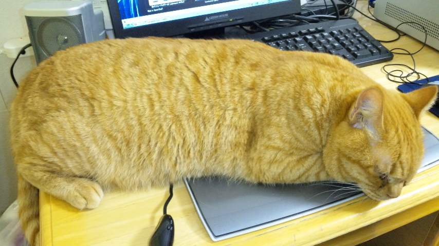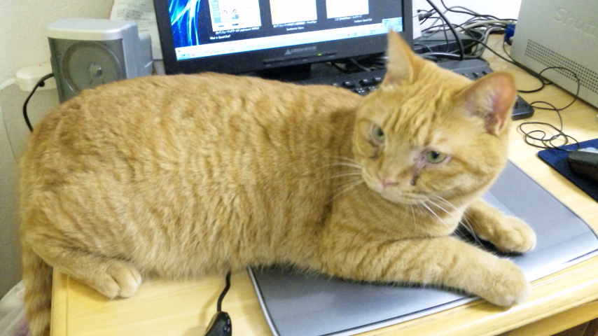 タブレットの上で寝る小太郎(邪魔)